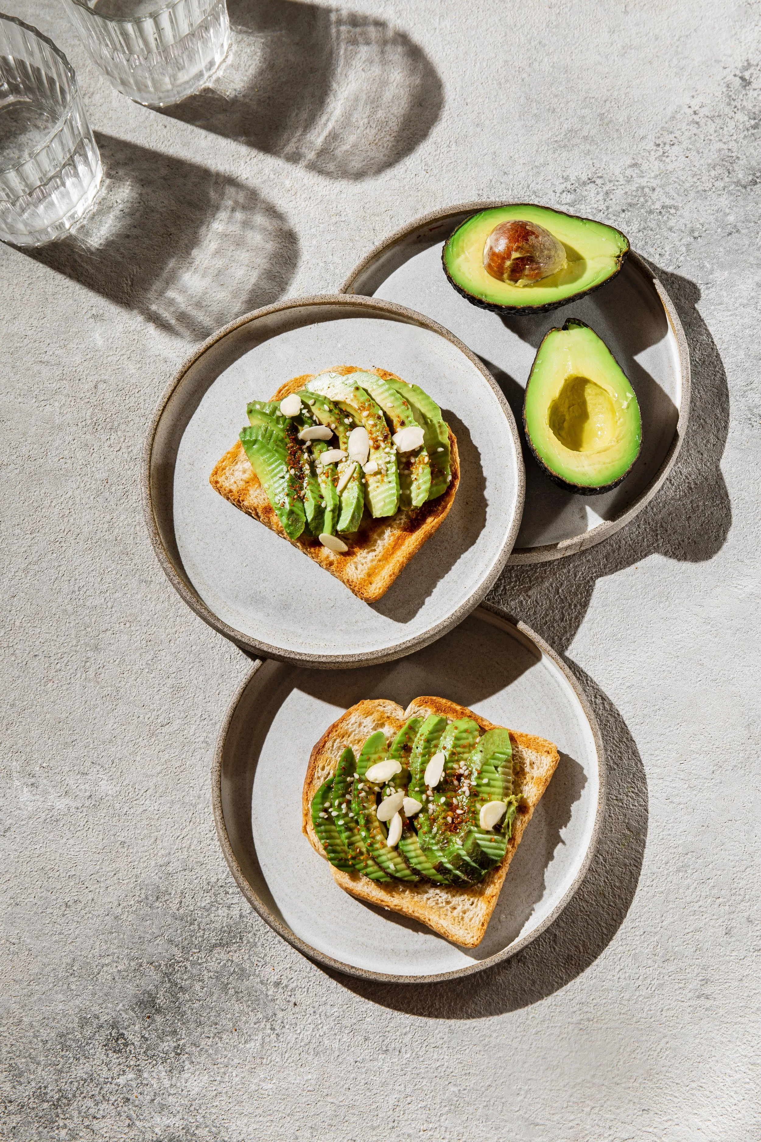Slices of bread with sliced avocado and almonds on small white plates, alongside halved avocados, on a light textured surface with two glasses of water.